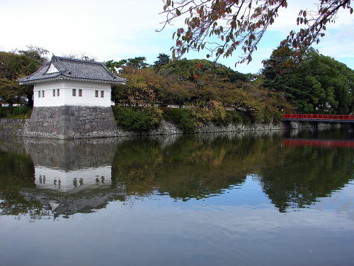 ![]() ▲二の丸東堀 小田原駅から「お堀端通り」を進むと、まず最初に東堀に至る。朱色の橋は学橋で、その奥(南側)には、二の丸隅櫓、馬出門土橋が連なる。 |