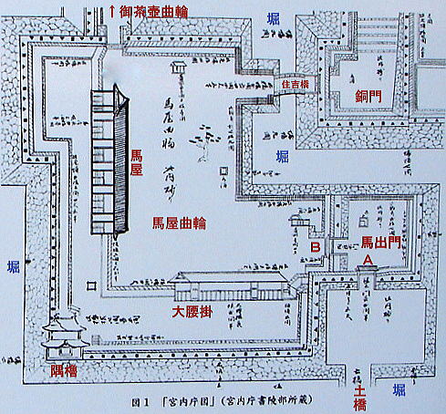 ![]() 馬屋曲輪は、L字型を呈する独立した曲輪。周囲に石垣を巡らせ、その上に土塁と塀を備えていた。曲輪内には、馬屋と大腰掛の二棟の建物を中心に番所、井戸があり、南東隅には隅櫓があった。 この曲輪は、三の丸より東側は「馬出門」、南側は「南門」を経て「御茶壺曲輪」から「銅門」へと至る重要な位置にある。 馬出門Aは馬出門、Bは内冠木門。内冠木門をくぐると左手には大腰掛(登城者の待機所)の建物があった。 |