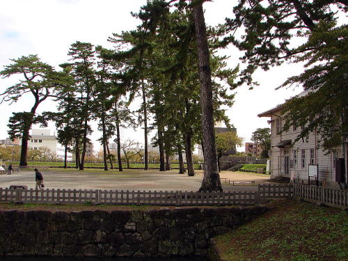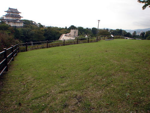 ![]() 御茶壺曲輪から見た馬屋曲輪 右側の建物は観光案内所(昭和初期建築の旧市立図書館)2階に歴史資料展示室がある。 観光案内所の左奥(南東隅)には、当時、二重櫓(右城図の隅櫓)が建っていた。 |