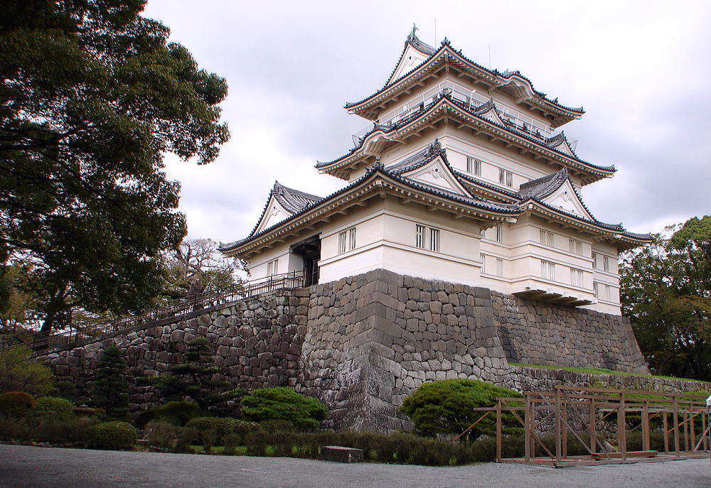 ▼小田原城天守![]() 三重四階の天守櫓に付櫓、渡櫓を取り付けた複合式の構成形式。構造は新式の層塔型である。昭和35年(1960)に地上38.7mの鉄筋コンクリート造りで復興された。なお、最上階の高欄付き廻縁は復興に際して新たに付けられた。 |