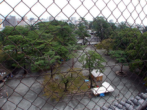 ![]() 天守からの本丸跡。後方は常盤木門。 |