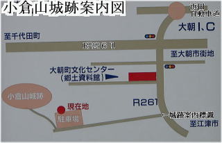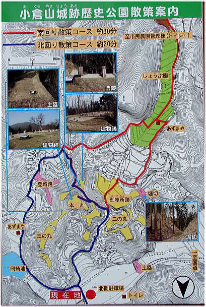 小倉山城は本丸郭群、二の丸郭群、三の丸郭群からなっており、複数の登城路で緊密に結ばれていた。本丸郭群の最高所には掘立柱建物跡、南側郭には、門や土塀に囲まれた建物跡があります。城の中心となる本丸郭群を中心に、城の最終時期の様子が復元整備されている。