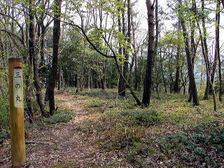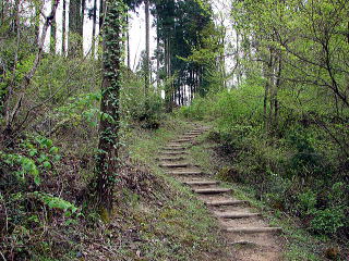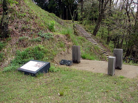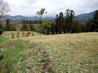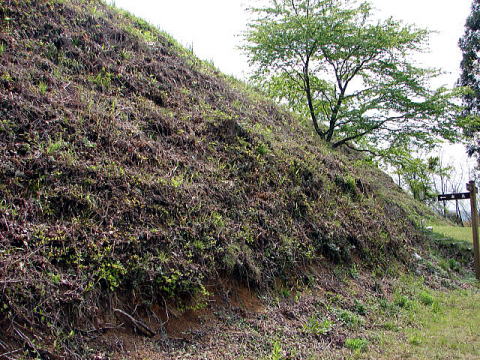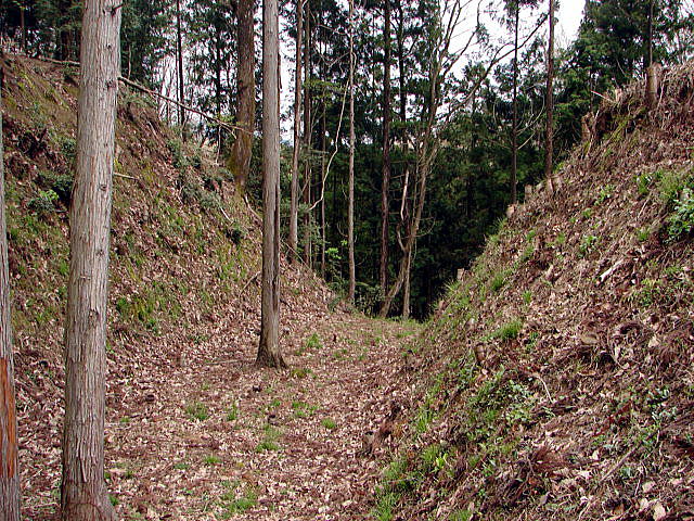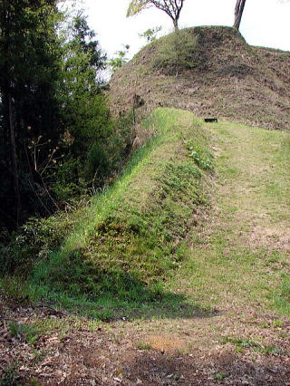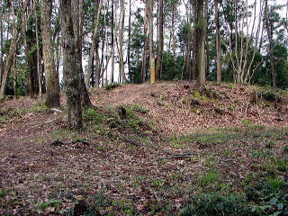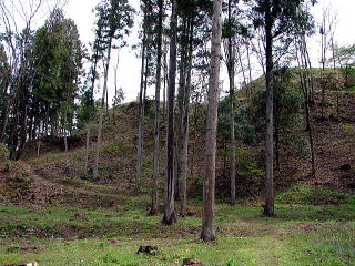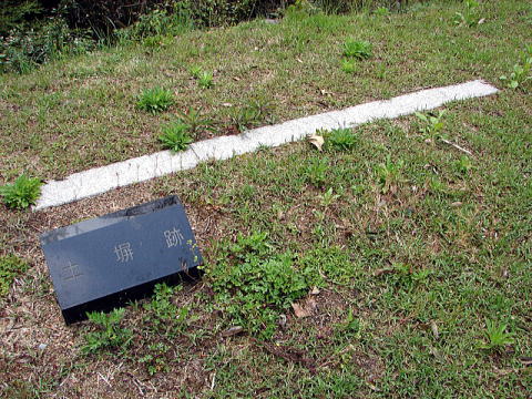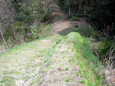土塁は、城内への敵の侵入を防ぐためのもの。<写真下>この先が三の丸。土塁の向う端右側には、登城路があった。<写真右>では、手前の土塁が切れている部分の左側が登城路。土塁後方は本丸郭。