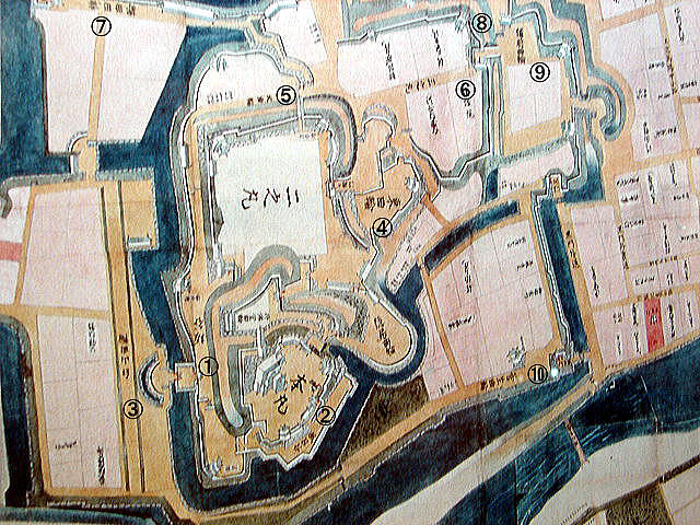 ![]() 岡崎城地図の一部 水野氏時代から後本多氏時代にかけての地図。本丸を中心に持仏堂・隠居・風呂谷などの曲輪が取り巻き、北から東に二の丸・三の丸・東・備前・菅生ほかの曲輪が広がる複雑な縄張りであった。三の丸は家老級の屋敷で、二の丸は藩主の住居である。 @坂谷曲輪 A風呂谷曲輪 B白山曲輪 C東曲輪 D北曲輪 E三の丸 F稗田曲輪 G浄瑠璃曲輪 H備前曲輪 I菅生曲輪 |