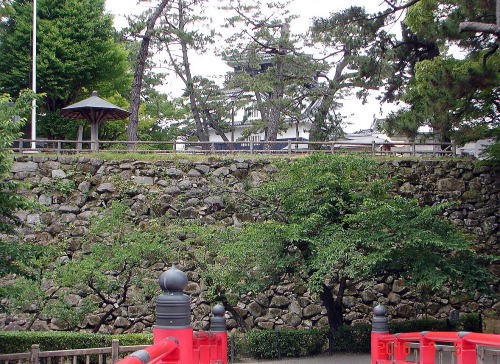 ![]() ▲神橋から見た本丸石垣。後方は天守 |