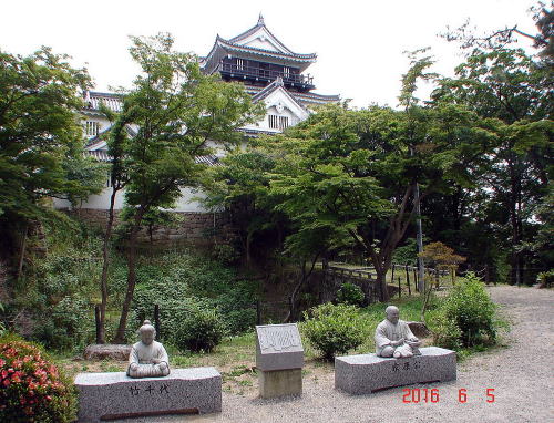 【岡崎城の沿革】岡崎城の期限は15世紀前半までさかのぼる。明大寺の地に西郷頼嗣(よりつぐ)によって築城されたのがそのはじまりである。その後、享禄4年(1531)に松平清康(家康の祖父)が現在の位置に移して以来、ここが岡崎城と称されるようになった。天文11年(1542)12月26日、松平竹千代(徳川家康)は、ここ岡崎城内で誕生した。家康は、6歳で織田信秀(信長の父)、8歳で今川義元の人質となり、少年期を他国で過ごしたが、永禄3年(1560)の桶狭間の合戦で、今川義元が戦死したことを契機に自立した。ときに19歳。以来、岡崎城を拠点(浜松城に移るまで11年間在城)に天下統一という偉業への基礎を固めた。 元亀元年(1570)、家康は本拠を遠江浜松(静岡県浜松)に移し、嫡男信康を岡崎城主とした。天正7年(1579)に信康が自刃したあとは、重臣の石川数正、ついで本多重次を城代とした。天正18年(1590)に家康が秀吉によって関東に移されると、秀吉の家臣田中吉政が城主となるが、家康が江戸に幕府を開いてからは、譜代大名にここを守らせた。 江戸時代、岡崎城は「神君出世の城」として神聖化され、本多氏(康重系統)、水野氏、松平(松井)氏、本多氏(忠勝系統)と、家格の高い譜代大名が城主となった。石高こそ5万石前後と少なかったが、大名は岡崎城主になることを誇りにしたと伝えられる。西郷氏が築いた当初の岡崎城は、砦のようなもので、城域も現在の本丸程度であったであろうと考えられるが、家康の頃までには近世の城郭としての原型ができあがった。田中吉政は、大規模な城郭の整備拡張を行い、文禄元年(1592)に、城の東・北・西に総延長4.7キロに及ぶ総堀を巡らした。また、元和3年(1617)本多康紀のときには、3層3階地下1階で、東に井戸櫓、南に付櫓をもつ複合天守に再建した。城郭の整備にともない東海道が城下に引き入れられ、慶長14年(1609)には伝馬町ができて、岡崎は東海道有数の宿場町として繁栄するに至った。明治維新を迎えると情勢は変わり、新しい時代には不要とされた城郭の大部分は明治6〜7年(1873〜74)にかけて取り壊されてしまった。 ※写真は徳川家康公銅像(岡崎公園内) |