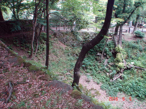 ![]() 坂谷門跡(門内側) 本丸西側の坂谷曲輪に設けられた枡形門。現在石垣が残る。門前方には丸馬出しが構えられていた。 |