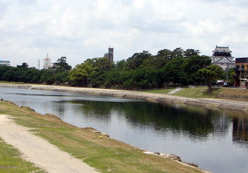 ![]() ▲乙川北岸に築かれた岡崎城址を殿橋から望む |