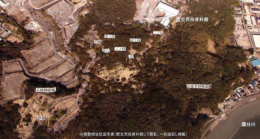 ![]() 山腹に建設された「高知県立歴史民族資料館」と「岡豊(おこう)城跡」 岡豊城は、四国を代表する戦国武将、長宗我部(ちょうそかべ)氏の居城跡。 【所在地】高知県南国市岡豊町八幡 【築 城】戦国時代 【主な城主】長宗我部氏 【形 式】平山城。標高97mの岡豊山に構築された東西に長い孤立丘陵 【遺 構】竪堀・空堀・井戸・曲輪・土塁など |