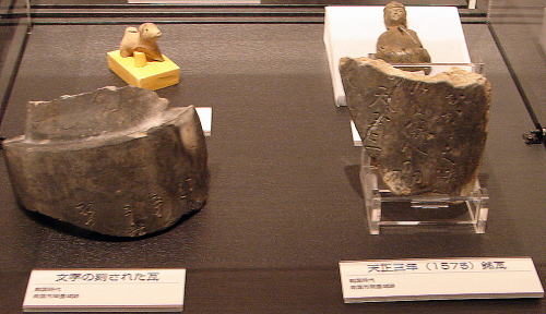 ![]() ▲文字を刻した瓦(歴史民俗資料館にて) 瓦は軒丸瓦や軒平瓦、平瓦、丸瓦などが出土していますが、文字を刻した瓦が2点出土しています。1つには、「おかうの御・・・・」「瓦工泉пi州)・・・・」「・・・天正三年(1575)・・・」と元親が土佐を平定した年の年号を刻しています。瓦は和泉大坂の瓦工人により製作されたものと考えられます。 |