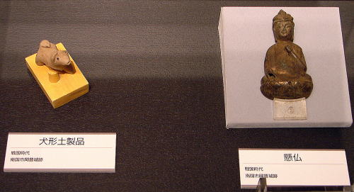![]() ▲出土した信仰に関係する懸仏、地鎮に使われた犬型土製品(歴史民俗資料館にて) 岡豊城跡からは、食器など |