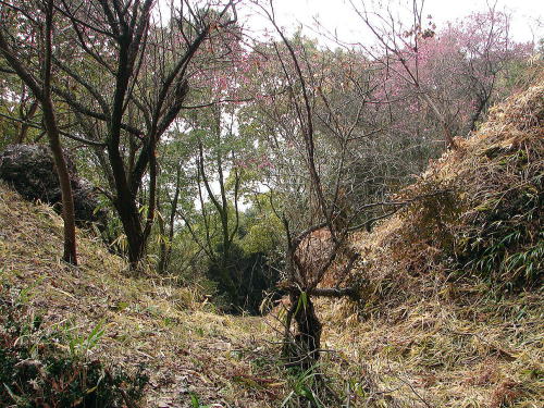 ![]() ▲堀切 詰と二ノ段の間にある堀切。堀切は、尾根などを空堀によって断ち切り、敵の侵入を防ぐ施設。幅3〜4m、深さ2m前後あり、岡豊城のなかでも最大の堀切です。 |