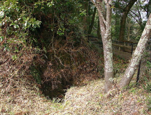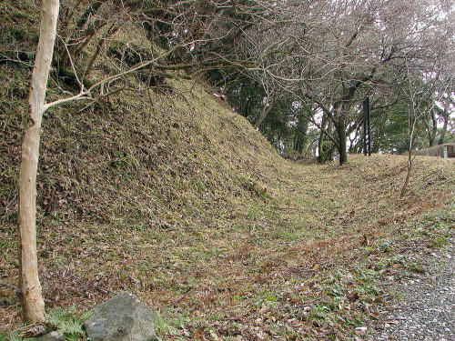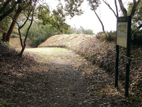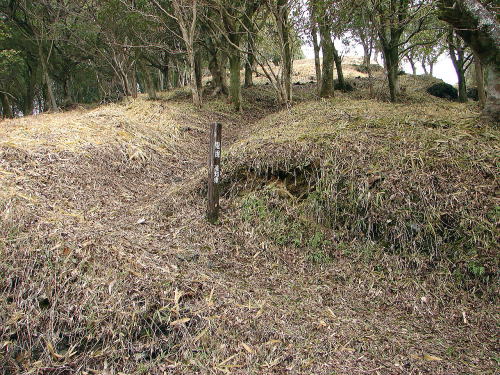 ![]() 一つの曲輪を囲む水のない堀を空堀と呼んでいます。虎口を守るために造られており、土塁とともに敵の侵入を防ぐ重要な役割をはたしています。この空堀は削られていますが、幅2.5m以上あったと考えられます。 |