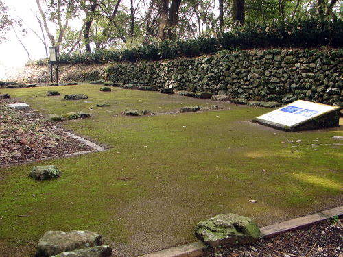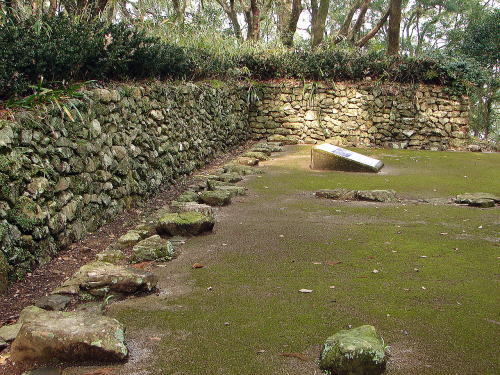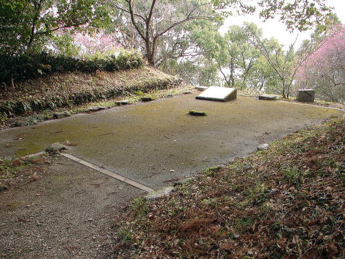 ![]() ▲詰 岡豊城跡の中心となる曲輪で、標高97mの岡豊山の頂上部にあります。1辺40mのほぼ三角形状で、東には二ノ段、南から西にかけては三ノ段、四ノ段が詰を取り巻くように造られています。詰南部からは、2棟の礎石建物跡と石敷遺構(建物の基礎)、土塁などがみつかり、重層構造の建物が存在していたと考えられています。詰からは天正3年(1575)の年号のある瓦をはじめ、土師質土器、輸入陶磁器、渡来銭、懸仏や地鎮の遺構がみつかっています。 |
