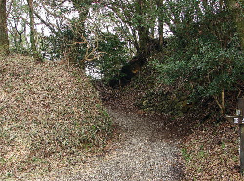 ![]() ▲四ノ段北部曲輪の虎口 四ノ段は、三ノ段の西部を囲むように造られた曲輪。この虎口は、土塁を曲げて横矢を掛けられるようにしてある。 |
