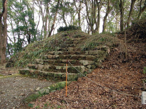 ![]() ▲三ノ段の石段 階段跡は岩盤を削り、両側は野面積石垣となっています。階段跡のすぐ北には建物跡が接しており、通路は南から階段を通り詰へと登るようになっています。 |