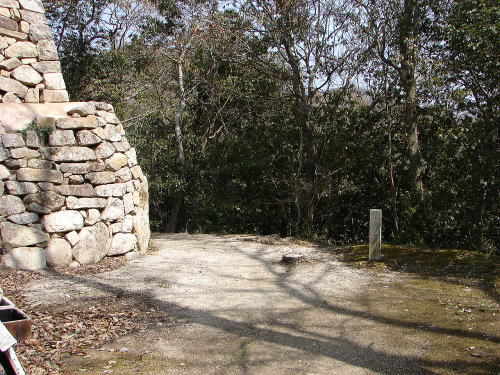 備中松山城(小松山城)本丸の後方(最北端)の水の手御門跡から遊歩道が通じている。石積上は、後曲輪、九の平櫓跡となり、大松山へは石積横を前方へと進む。