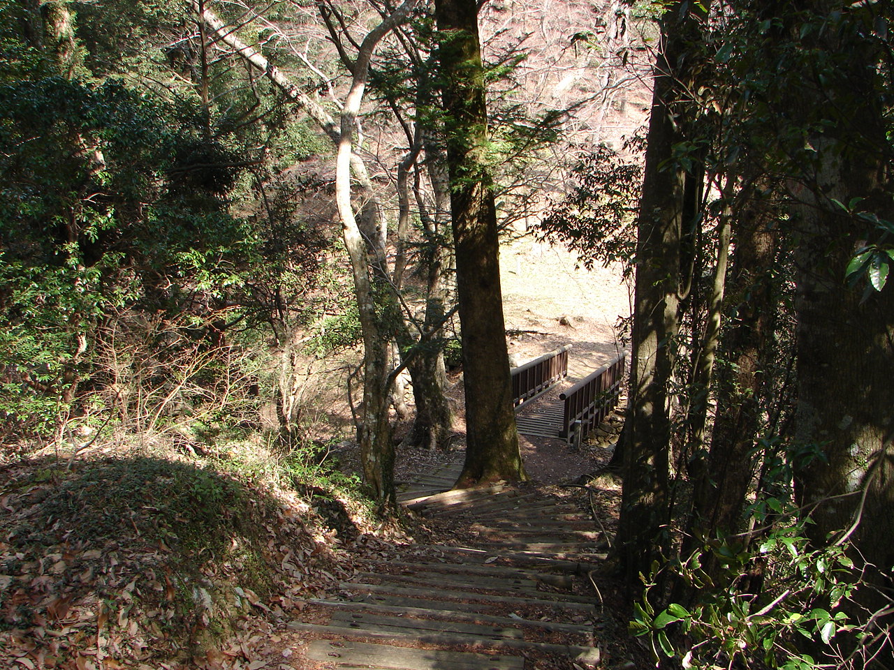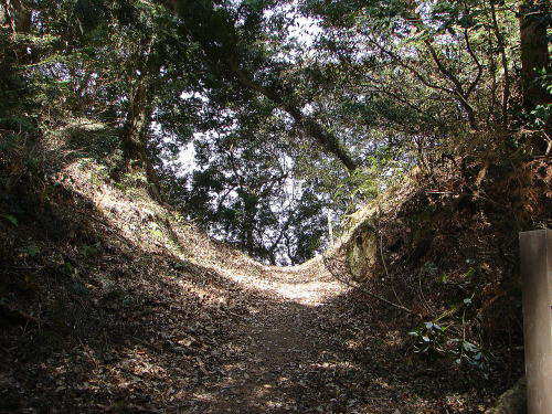 遊歩道には石垣の上に築かれた土橋が架かる。大松山城へは、ここから徒歩20分ほど。途中には相畑城戸跡、天神の丸、大池などの遺構が点在。 |