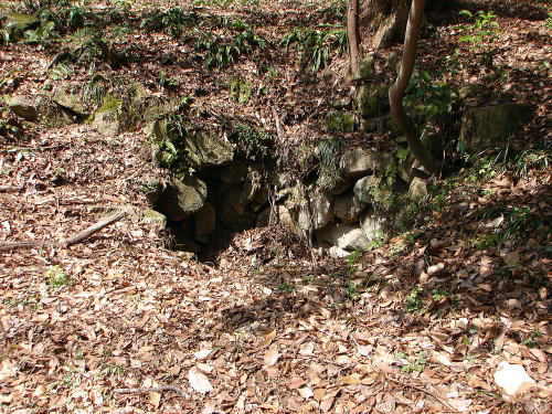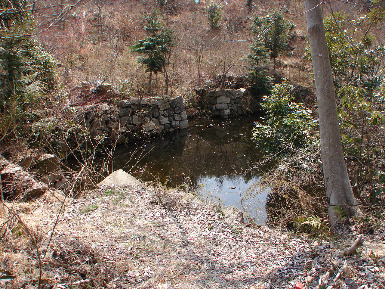 石積で作られた方形の池。地元では「血の池」と呼ばれ、人の首や戦で使われた刀を洗ったと伝えられる。別名「首洗いの池」。山中に数ヵ所ある水利(井戸や溜井戸)のうち最大のもので、総石積の人工池。日照りが続いても乾かない渇れないよう屋根がかけられ、小舟が浮かべられていたという江戸時代の記録が残る。