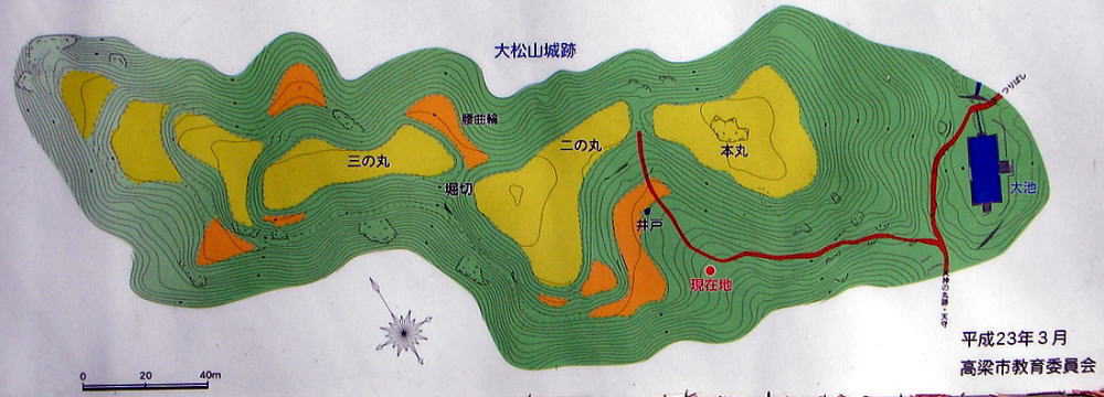 標高470mの大松山山頂と西に延びる尾根上に位置しています。延応2年(1240)に有漢郷(現高梁市有漢町)の地頭であった秋庭(あきば)三郎重信が築城したと伝えられています。臥牛山ではじめて城が築かれたところで、中世城郭の遺構が残っています。