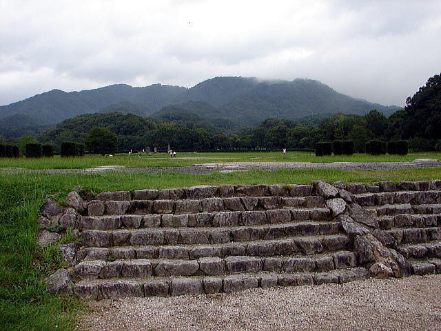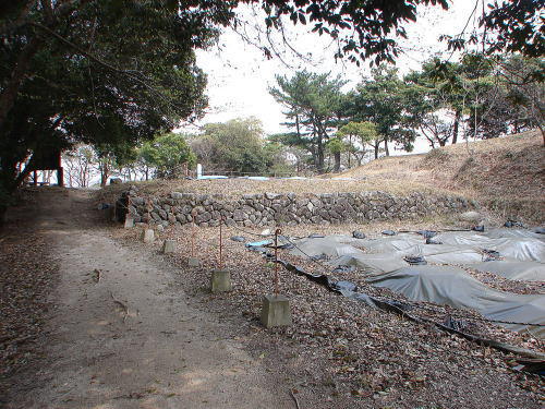 ![]() 北石垣 その後、平成15年の豪雨でも前回以上の大きな被害を受けたため、平成18年には3ヵ所で調査が行われました。その結果、西側の2ヵ所で前回確認された石垣の下側に新たに版築盛土が見つかり、上段の盛土と石垣はこの下段盛土を基礎として階段状に築かれていることが判明しました。また、これまで2ヶ所に分かれると考えられていた北石垣が、全長約45メートルにわたる一連のものである可能性が高くなりました。 |