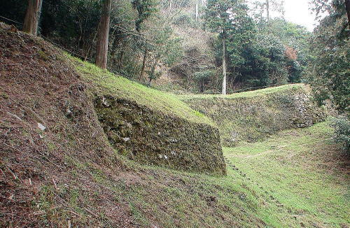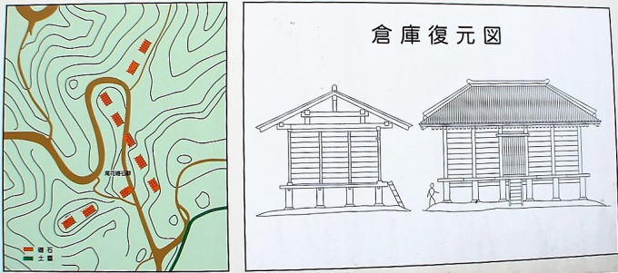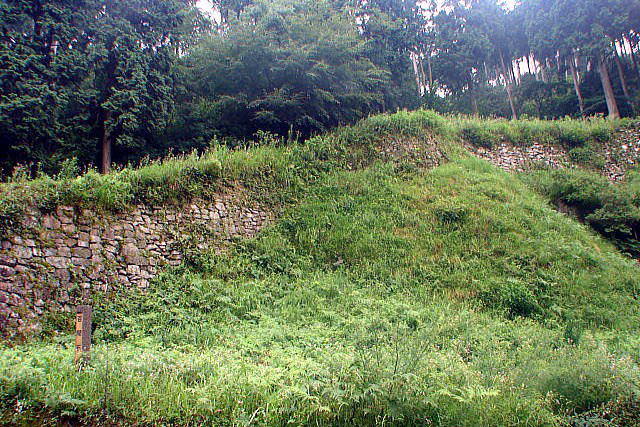 《小石垣(こいしがき)》小石垣は城の東北部にあり、二重土塁の内側の石塁である。石塁はほとんど崩れてしまったが、上端幅5m・高さ10m・両岸間30mほどで、水門もあったのだろう。見えている石垣のほかに地下に残っている部分がある。 ![]() (復元図と城地図は説明板より) |
