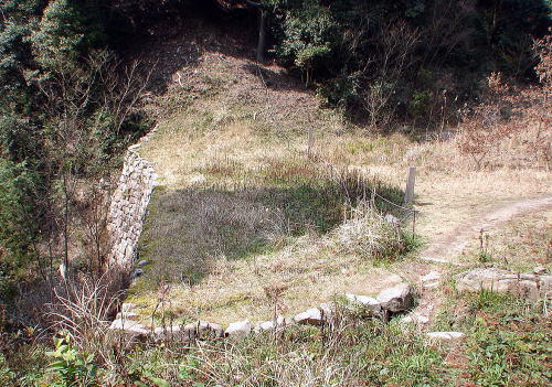![]() 大野城百間石垣 大野城の城壁は土を高く盛り上げた「土塁」で囲まれているが、起伏の激しい地形のため谷間は土塁でなく石を積み上げたダムのような石塁とし、急傾斜部は石垣を作るなど工夫をこらしている。この「百間石垣」の名称は、四王寺川の部分を石塁とし、それに続く山腹部を石垣とした城壁で、長さが180mほどであることから名付けられたものである。 平均4mくらいの高さが残っており、川底部では石塁幅は9mほどある。外壁面の角度は75度前後である。この川の中から今までに3個の礎石などが発見されており、川に近い場所に城門があったと考えられる(現地説明板より)。 |