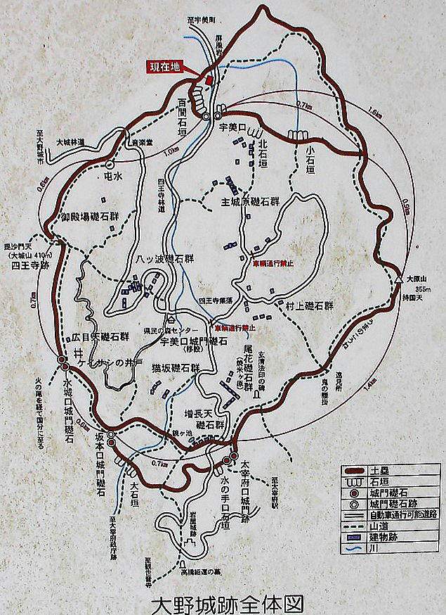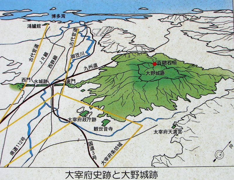 特別史跡 大野城跡 [所在地]福岡県糟屋郡宇美町、太宰府市、大野城市 [史跡指定日]昭和28年3月31日 大野城は白村江(はくすきのえ)の戦(663)の後、唐・新羅からの侵攻に備えて西日本各地に築かれた山城の一つで、北西の水城、南方の基肄(きい)城とともに太宰府政庁を中心とした防衛ラインを形成していました。この山城は百済の亡命高官2名による戦略的・技術的指導のもと築城されたことが『日本書紀』に記されることから、一般に朝鮮式山城と呼ばれています。 大野城は政庁の北に聳える四王寺(しおうじ)山中(標高約409m)にあり、北は博多湾から南は築後方面を眼下に納める絶好の場所に立地し、山頂と山腹に土塁が、谷間には石垣が構築されています。現在、確認されている城内への入口は5ヵ所あり、食料の備蓄や居住に利用されたと考えられる70棟余りの建物が丘陵を造成した平坦面に残されています(文と下の「太宰府史跡と大野城跡」「大野城跡全体図」は説明板より)。 |