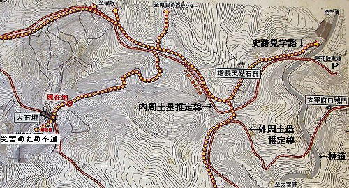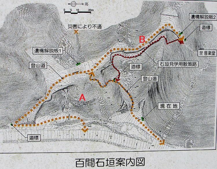 ![]() 「百間石垣案内図」B周辺 石垣上にも登山道が敷かれている。 |