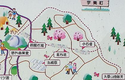 ![]() 「百間石垣案内図」B周辺 登山道の下から見た石垣群。 |