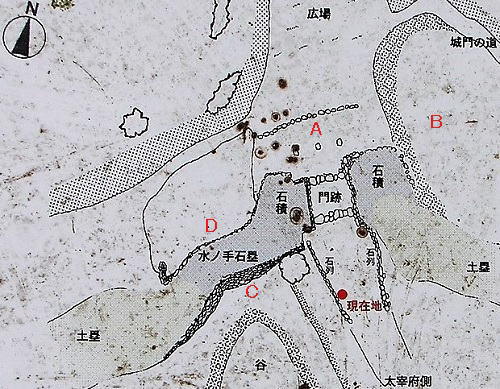 ![]() 「太宰府口城門の全体図」(説明板にA・B・C・Dを追記) 「太宰府口城門の全体図」は以後「全体図」と記載 |