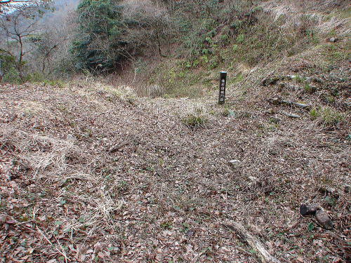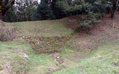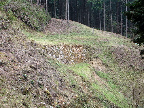![]() 「全体図」Bの様子 門跡左側の石積から、焼米ヶ原(左斜め上方)に延びる土塁。 |