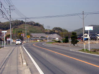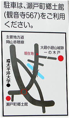 写真は左の「道路標識看板」○部分の場所。主要地方道岡山赤穂線を瀬戸駅方面に向って、左側に瀬戸町郷土館があるところを右に曲がります。![]() 右に曲がる所にある標識 ![]() |