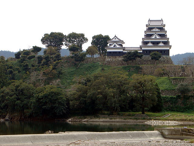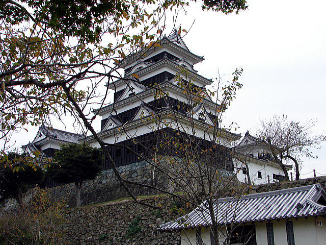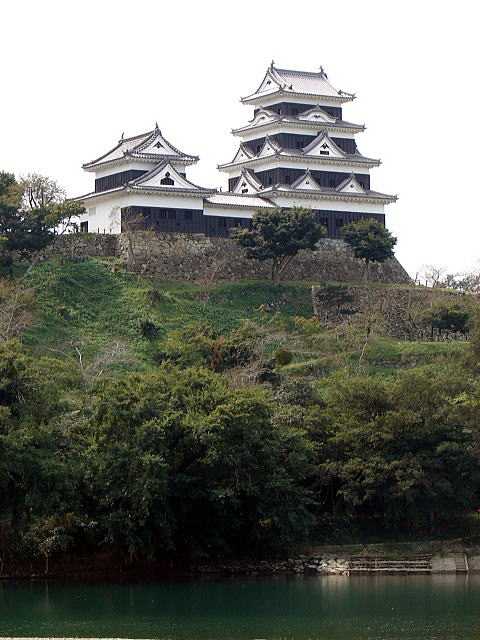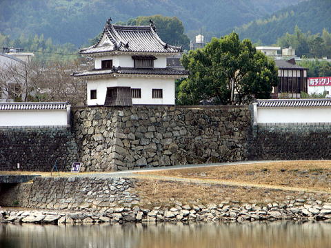 大洲城は、肱川に面した小丘(地蔵嶽・比高30m)を中心として縄張され、外堀に肱川の流れを利用した平山城。城跡は県史跡。4棟の櫓(台所櫓・高欄櫓・苧綿(おわた)櫓・三の丸南隅櫓)が国の重要文化財に指定。