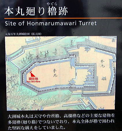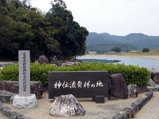 苧綿櫓(写真左)の傍に建つ「神伝流発祥の地」の石碑。