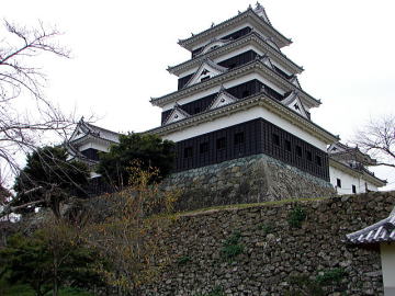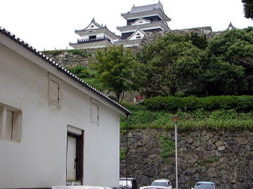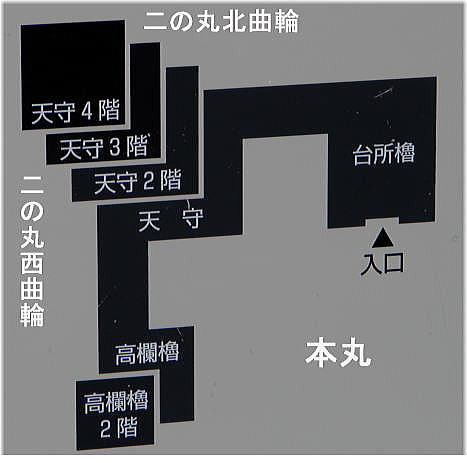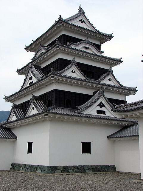 四重四階の層塔型天守の両脇に高欄櫓(左)、台所櫓(右)が多聞櫓で連結している