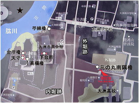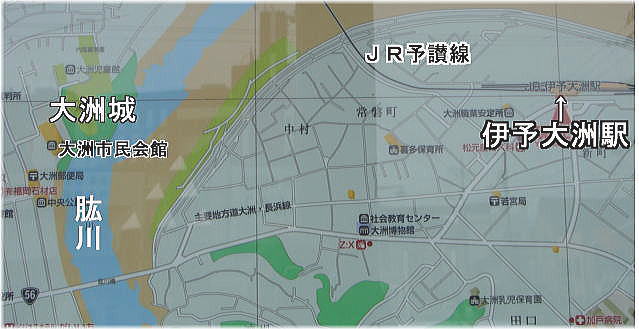 大洲城は、地蔵嶽・亀ヶ岡城・大津城などと呼ばれ、城は、丘陵の上部を本丸として、東に肱川、北に久米川、西と南は堀をめぐらしていた。
