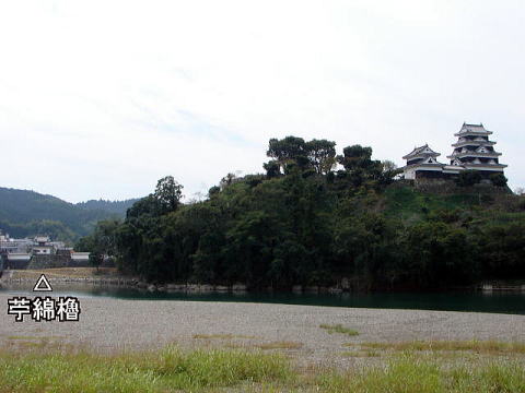 ▲肱川に面した本丸東側は木立が生い茂っているが、木立の途切れたところに苧綿櫓が位置する。