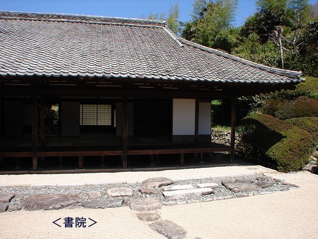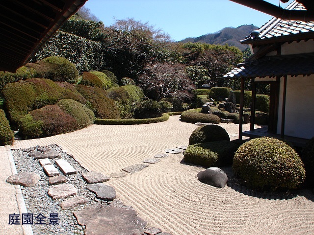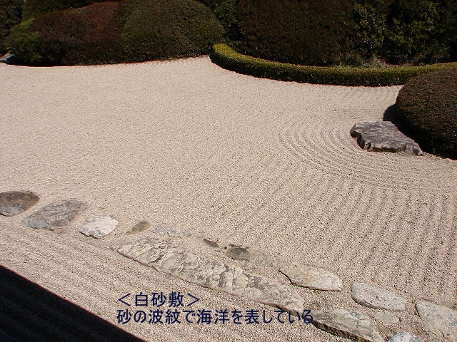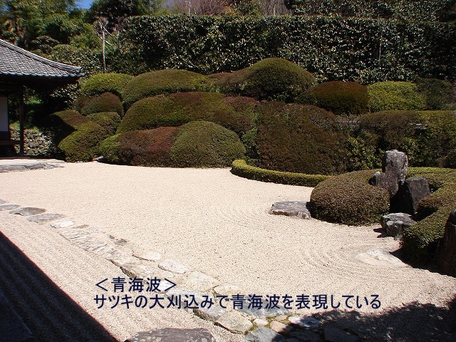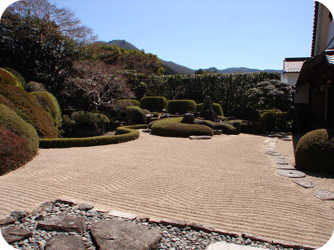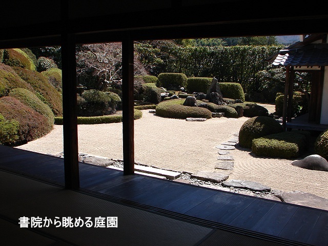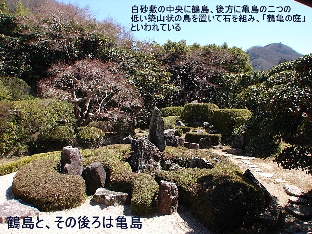 本庭園は書院東南面の庭園であって、蓬莱式枯山水庭園です。白砂敷の中央に二つの低い築山状の島を置いて石を組み(鶴島・亀島)、書院左手の山畔に沿ってサツキの大刈込が植えられ、大海を表しています。また二島の間には簡素な地割の池があり、正面遠景の愛宕山を借景にした平庭です。この庭園の石組及び地割の主要部には江戸時代初期の手法がみられ、保存管理状態は良好で、全体としてすぐれた意匠を残しています。平成21年7月には、本堂や書院などが指定地に追加され、頼久寺全体が名勝に指定されています。(現地説明板より)