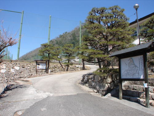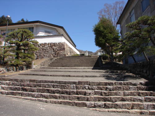 ■備中松山藩主の居館と藩庁をかねた御根小屋跡〜現在は、岡山県立高梁高等学校の敷地となり、石垣や御殿の一部が残る。後方の山は臥牛山。(写真左・右)
