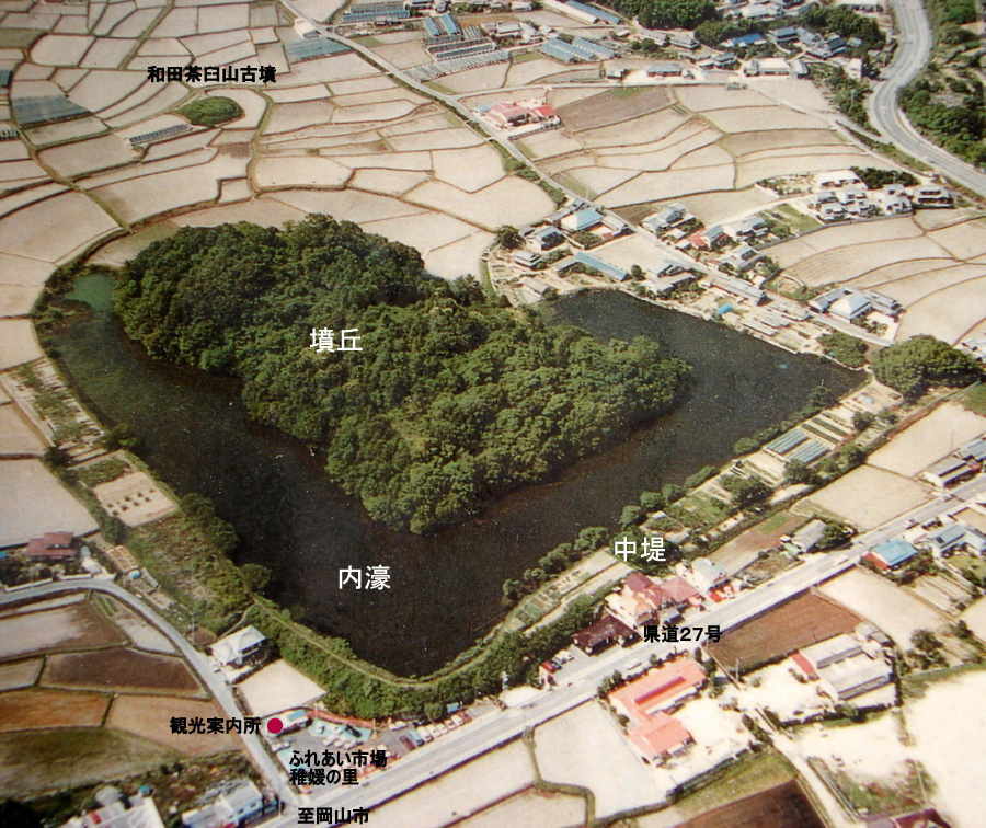 ![]() 和田茶臼山古墳(左の帆立貝形の墳丘)と両宮山古墳(右側の樹木が生い茂る部分) 帆立貝形の部分が和田茶臼山古墳の後円部で、その前が前方部となる。 岡山県の文化財に戻る |