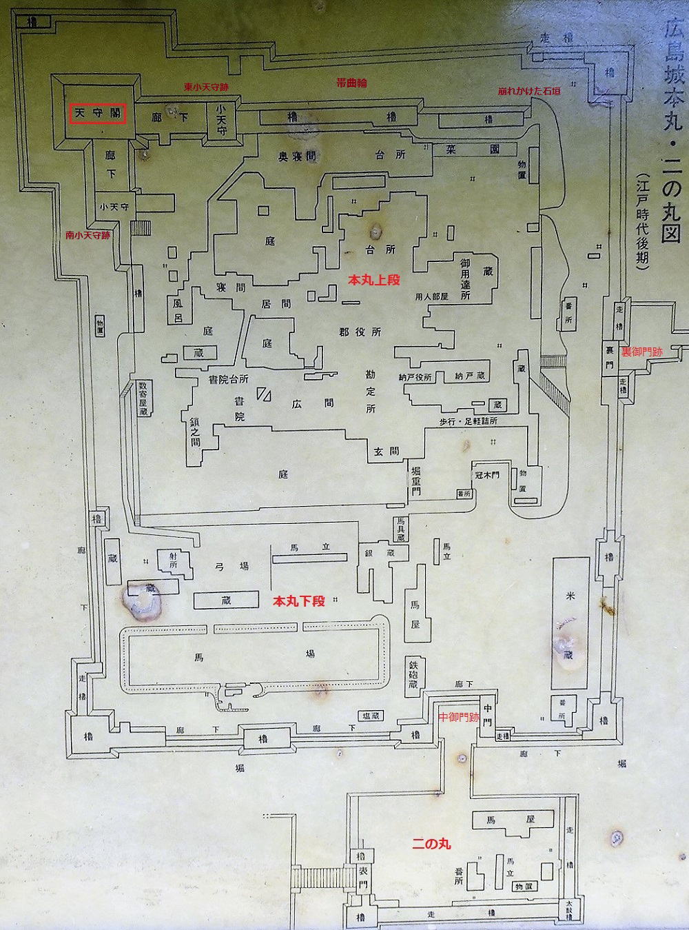 [広島城本丸・二の丸図(江戸時代後期)]![]() 説明板に追記(赤字)し掲載 |