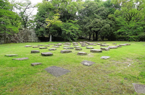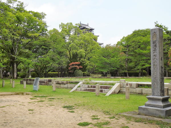 ![]() 旧天守閣の礎石 ここにすえ付けてある石は昭和33年天守閣再建に際して、もと、天守閣柱下の礎石を掘り起こして原型のまま移したものです。 |