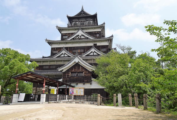 ![]() 天守閣正面(南面) 5層からなり、最上階の廻縁付き望楼には花頭窓が付く。 |