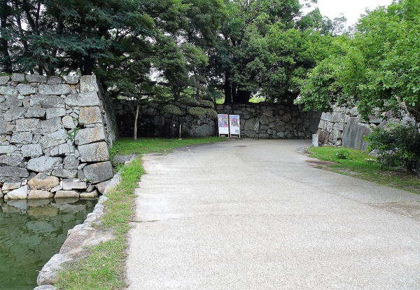 ![]() 中御門跡 土橋(二の丸側)から見た中御門跡。二の丸から本丸への出入口となり、かつてはここに門柱や扉に鉄板を打ち付けた鉄門(くろがねもん)の本丸中御門があったが、原爆により焼失。 |