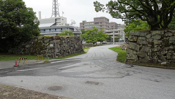 ![]() 中御門跡 本丸側から見た中御門跡。この部分は「枡形」と呼ばれる小さな区画で、土橋を渡り本丸へ侵攻する敵に対して、三方から攻撃を仕掛けることができる。 |