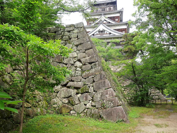 ![]() 帯曲輪と本丸上段の石垣 本丸上段の東西と北には、帯曲輪がめぐる。この場所は、本丸上段北側部分です。後方は、天守閣です。 |