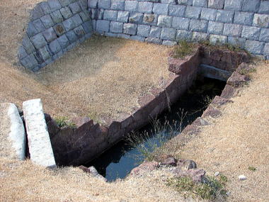 ![]() 石製樋管と赤石積水路 西側土塁石垣の下を潜る水路と、 これに続く赤石を用いた当時の水路。 |