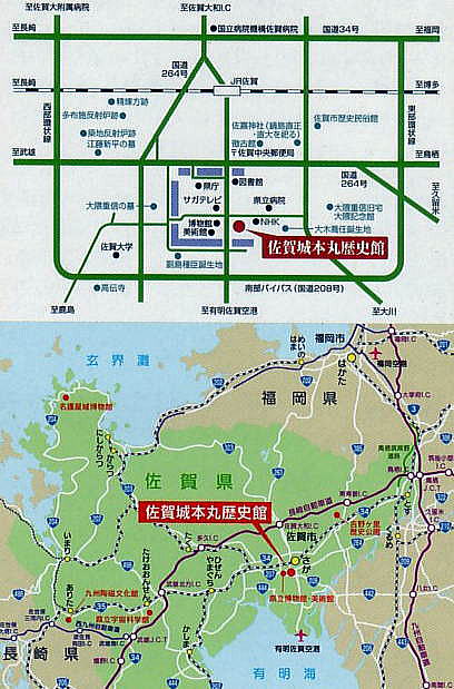 | 佐賀城周辺図 JR佐賀駅よりバスで約10分。徒歩約30分。 ![]() (佐賀城本丸歴史館パンフレットより) |