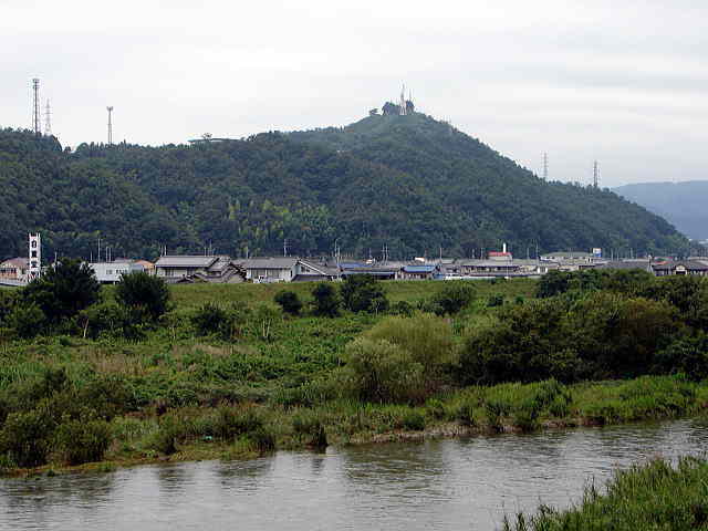 芦田川に架かる佐賀田橋付近より望む相方城跡。テレビ塔のある中央の一番高い山
